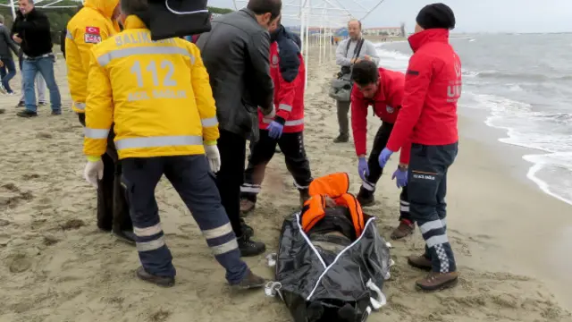 Yine İzmir'in Dikili ilçesinden yola çıkan bir diğer şişme bot da yine kötü hava koşulları nedeniyle alabora oldu ve en az 20 kişinin cesedi sahile vurdu.