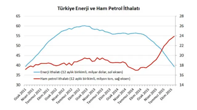 Benzerini Merkez Bankası başkanı Erdem Başçı'nın geçtiğimiz hafta bakanlar kuruluna yaptığı sunumda gösterdiği aşağıdaki grafik, hızla yükselen akaryakıt talebine cevap vermek için Türkiye'nin ham petrol ithalindeki artışa rağmen enerji ithalat giderinin azaldığını gösteriyor.