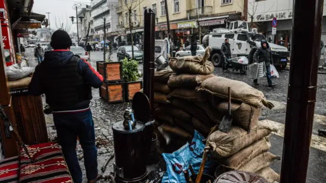 "Bu arada Diyarbakır'daki çatışmalar devam ediyor. Çatışmalar birkaç küçük mahallede yoğunlaştığı için şehirde topyekûn bir şehir savaşıyla normal yaşamın gerçek üstü bir birleşimi yaşanıyor. Aileler uzaktan gelen top ve silah sesleri sohbetlerini keserken öğle yemeklerini yemek için alışveriş merkezlerine giriyor."