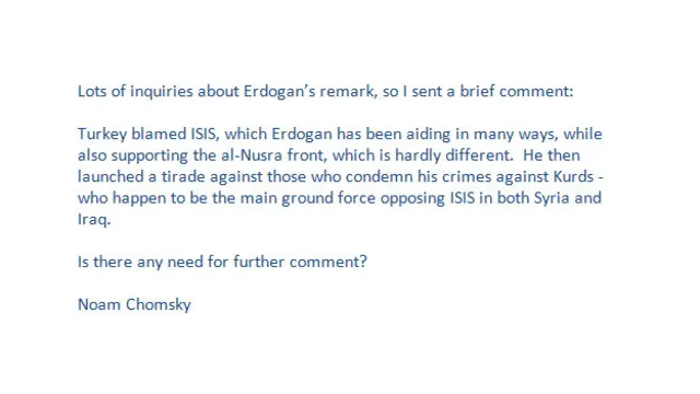 "Türkiye, Erdoğan'ın birçok yoldan yardım ettiği IŞİD'i suçluyor, aynı zamanda, çok da farklı olmayan El Nusra Cephesi'ni destekliyor. Daha sonra da, hem Suriye'de hem de Irak'ta IŞİD'e karşı karadan savaşan ana güç olan Kürtlere karşı işlediği suçları kınayanlara karşı nutuk atıyor. Daha başka bir yoruma ihtiyaç var mı?"