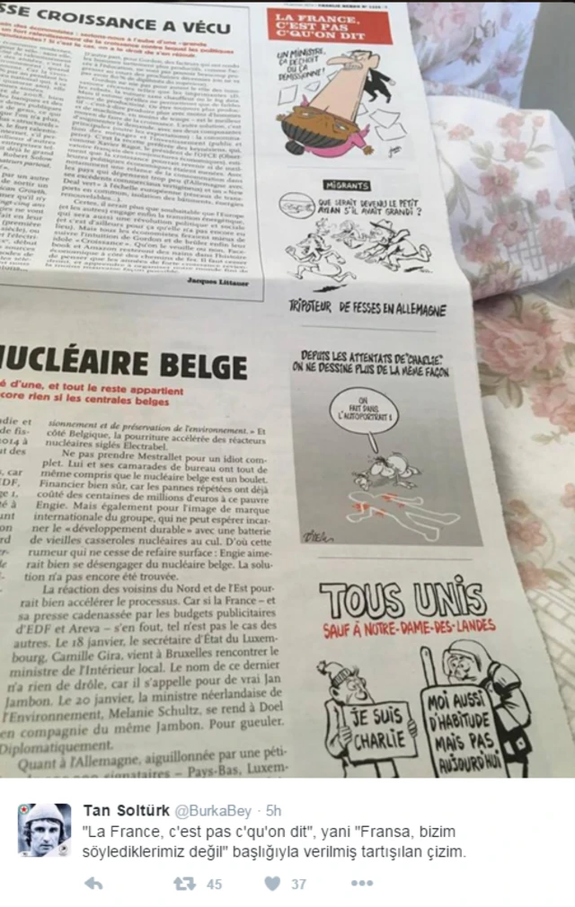 "Mesela ilk karede Fransa'nın kozmopolitliğine vurgu yapan adalet bakanı Taubira ve tepki gösteren başbakan Vals var. İlla satirik dergiyi, komiklik karikatür şaka dergisi olarak ele alacaksanız da 3. kare'de kendi ölümleriyle dalga geçiyorlar mantığınızla. Son karede de Notre-Dame-des-Landes'daki havaalanı inşaatına karşı direnen halk ve polisin iki yüzlülüğüne vurgu yapılmış."
