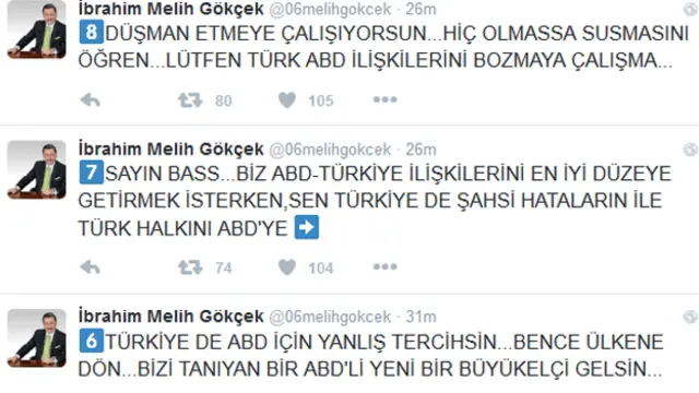 Twitter üzerinden ABD Büyükelçisi John Bass'a 10 mesajlık bir cevap yazan Ankara Büyükşehir Belediye Başkanı Melih Gökçek, "Türkiye için de ABD için yanlış tercihsin... Bence ülkene dön...Bizi tanıyan bir ABD'li yeni bir büyükelçi gelsin..." dedi.