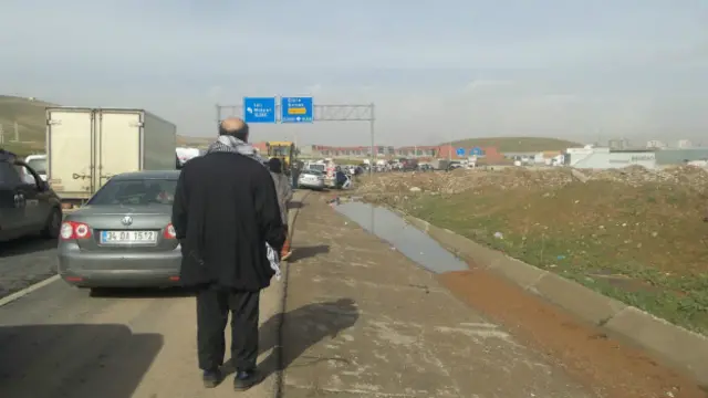 Yaklaşık bir buçuk saat bekledikten sonra bir hareketlilik oluyor ve bazı sivil araçların geçişine izin veriliyor. Cizre’nin girişinde kontrol noktasında bekleyen yüzlerce araçla karşılaşıyoruz.
