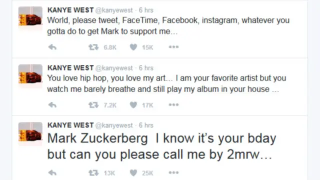 Kanye West, bunun için Twitter'dan Zuckerberg'i adeta mesaj yağmuruna tuttu.