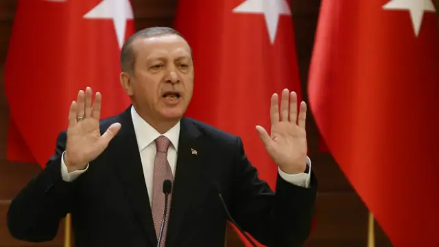 Erdoğan, Suriye - Türkiye sınırında bulunan Azez kasabasına doğru ilerleyen YPG'yi kastederek, "Güney sınırımızda yeni bir Kandil'in oluşmasına asla izin vermeyeceğiz" diye konuştu.
