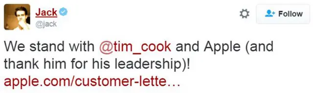 Twitter'ın CEO'su Jack Dorsey ise FBI - Apple tartışmasına <link type="page"><caption> Twitter</caption><url href="https://twitter.com/jack" platform="highweb"/></link> üzerinden dahil oldu ve "Apple ve Tim Cook'un yanındayız (ve gösterdikleri liderlik için teşekkür ediyoruz!)" dedi.