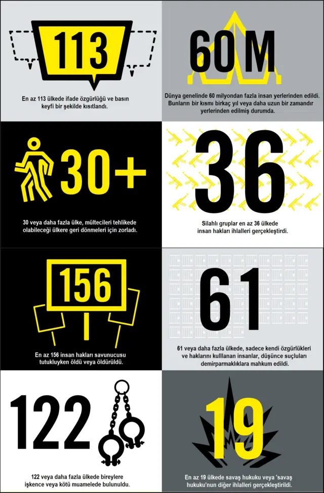 Hükümetlerin insan haklarını güvenlik, kanun ve "ulusal değerlere" karşı bir tehdit olarak gösterdiklerini söyleyen örgüt, "milyonlarca insan devletlerin ve silahlı grupların elinde eziyet görüyor" dedi.