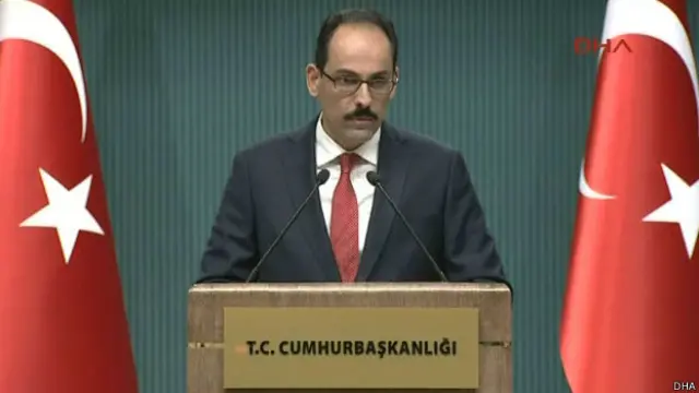 Kalın "Türkiye'nin ulusal güvenliğini tehdit eden durumlar ortaya çıktığı müddetçe Suriye'nin neresinden gelirse gelsin, ister DAİŞ'ten gelsin ister YPG-PYD gibi örgütlerden gelsin, Türkiye uluslararası hukuktan kaynaklanan haklarını kullanır, angajman kurallarını uygular. Biz müttefiklerimizle, dost ülkelerle her konuyu müzakere ederiz, istişare ederiz ama Türkiye'nin ulusal güvenliği asla bir müzakere ve pazarlık konusu değildir" dedi.