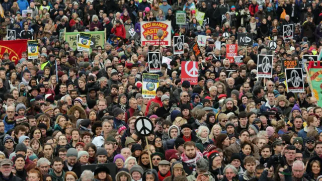 Protesto gösterisinde konuşan muhalif İşçi Partisi lideri Jeremy Corbyn, "Barışı demokrasiyle, insan haklarına saygıyla, eşitsizliğe son vererek ve kaynakları paylaşarak başarırsınız. Barışı, savaş planları yaparak ve birbirinin kaynaklarını ele geçirerek, diğerlerinin insan haklarına saygı göstermeyerek başaramazsınız" dedi.