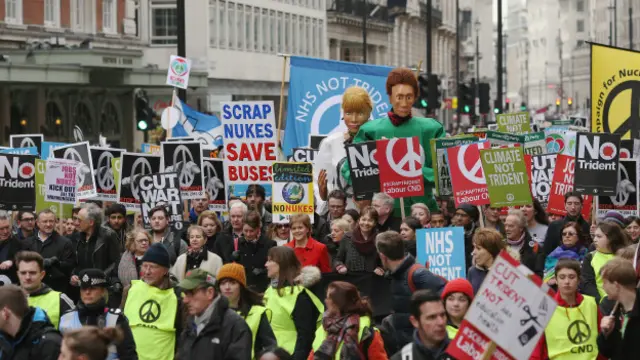 Guardian gazetesinin 'bir neslin en büyük nükleer karşıtı gösterisi' olarak tanımladığı eylem, İngiltere'nin nükleer denizaltı programı Trident'in yenilenmesi programına karşı düzenlendi.