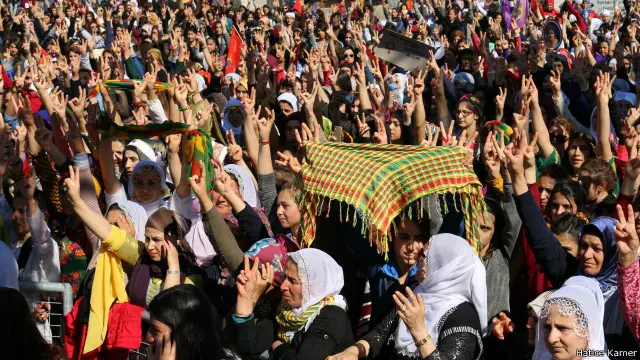 Sosyalist Kadın Meclisi, Özgür Genç Kadın, KJA amblemleri, " Öz savunma ile özgürlüğe; êdî bese (yeter artık); Jin, Jiyan, Azadi (kadın, yaşam, özgürlük)" yazılı pankartların dikkat çektiği mitingin katılımcıları, Paris ve Silopi'de öldürülen Kürt kadın siyasetçinin ve Kobani ve Sur'da hayatını kaybeden savaşçı genç kadınların fotoğraflarını taşıyarak "yaşasın Sur direnişi" sloganıyla Demokratik Toplum Kongresi önünden İstasyon Meydanı'na doğru yürüyüşe geçtiler.