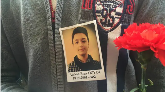 15 yaşındaki Atakan Eray Özyol’un yaşıtı arkadaşları geliyor avluya sonra. Ellerinde karanfiller, yakalarında arkadaşlarının fotoğrafı.