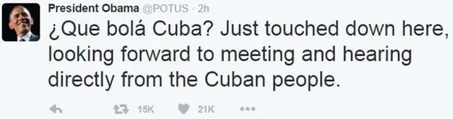 <link type="page"><caption> ABD Başkanı Küba'ya inişinin ardından attığı Tweet'te</caption><url href="https://twitter.com/POTUS" platform="highweb"/></link> "Küba halkıyla buluşmayı ve onları bizzat dinlemeyi iple çekiyorum" demişti.