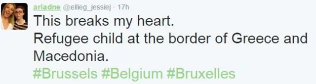<link type="page"><caption> @ellieg_jessiej</caption><url href="https://twitter.com/ellieg_jessiej/status/712246784790241280" platform="highweb"/></link> adlı Twitter kullanıcısı, 'Brüksel için üzgünüm' mesajına "Bu görüntü kalbimi parçalıyor. Yunanistan - Makedonya sınırındaki mülteci çocuk <link type="page"><caption> #Brussels</caption><url href="https://twitter.com/hashtag/Brussels?src=hash" platform="highweb"/></link><link type="page"><caption> #Belgium</caption><url href="https://twitter.com/hashtag/Belgium?src=hash" platform="highweb"/></link><link type="page"><caption> #Bruxelles</caption><url href="https://twitter.com/hashtag/Bruxelles?src=hash" platform="highweb"/></link>" mesajıyla yanıt verdi.