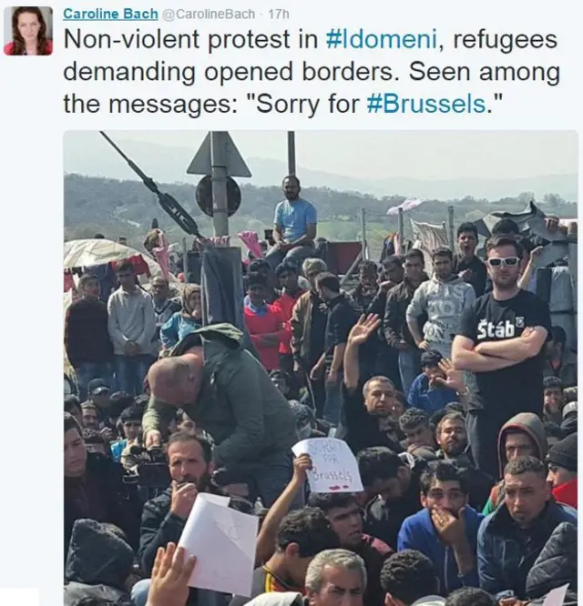 Kapmptaki protesto devam ederken orada bulunan Kızılhaç görevlisi <link type="page"><caption> @CarolineBach</caption><url href="https://twitter.com/CarolineBach/status/712250406244642816" platform="highweb"/></link> ise çektiği fotoğrafı paylaşırken "<link type="page"><caption> #Idomeni</caption><url href="https://twitter.com/hashtag/Idomeni?src=hash" platform="highweb"/></link>'de şiddet içermeyen bir protesto. Mülteciler sınırların açılmasını talep ediyor. Yazılı mesajlar arasında 'Brüksel için üzgünüm' var" dedi.