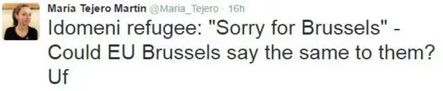 İspanyol haber ajansı EFE'nin Brüksel temsilcisi <link type="page"><caption> @Maria_Tejero</caption><url href="https://twitter.com/Maria_Tejero/status/712253420690739202" platform="highweb"/></link> ise mültecilerin Brüksel için verdikleri mesajın AB tarafından karşılık bulmayabileceği görüşünde: