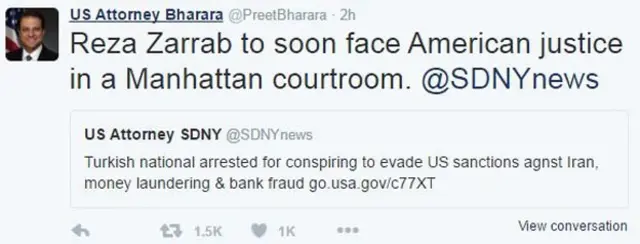 Bharara, <link type="page"><caption> Twitter hesabından</caption><url href="https://twitter.com/PreetBharara" platform="highweb"/></link> paylaştığı bir mesajda ise "Reza Zarrab çok yakında Manhattan Adliyesi'nde Amerikan yargısıyla yüzleşecek" dedi.