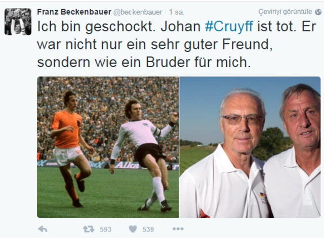 Johan Cruyff gibi dünyanın gelmiş geçmiş en büyük futbolcuları arasında gösterilen ve Hollandalı futbol adamı ile gerek milli takım gerek kulüp takımları düzeyinde unutulmaz maçlar oynayan Franz Beckenbauer ise Cruyff'u bir kardeş olarak gördüğünü söyledi.