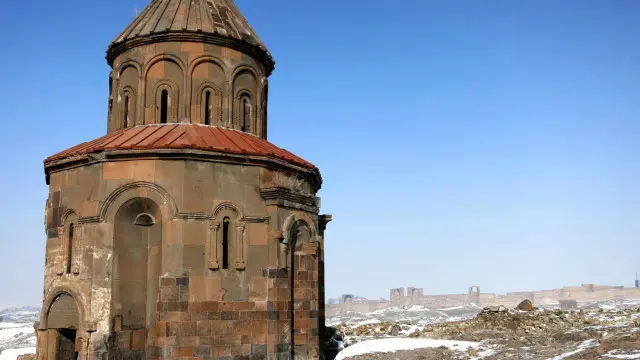 Kırmızı taşlarıyla Ani Katedrali terkedilmiş kente hakim bir konumda bulunuyor. 1319’daki bir depremde tavanı, daha sonraki bir depremde ise başka bir köşesi yıkılan kilisenin boyutları bugün bile görkemli görünüyor.