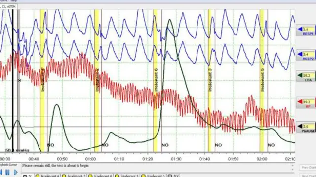 (Tabloda yatay eksen zamanı, sarı sütunlar her bir soruyu, mavi çizgiler solunum hızını, kırmızı nabız ve tansiyonu, ince siyah çizgi sandalyedeki kıpırdanma derecesini, kalın siyah çizgi ise cilt elektrik tepkisini gösteriyor.)