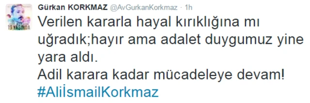 DHA'nın haberine göre anne Emel Korkmaz karara ilişkin "Bu ülkenin adaleti buymuş. Başka bir şey demiyorum. 19 yaşındaki bir çocuğun değeri bu kadarmış" dedi.