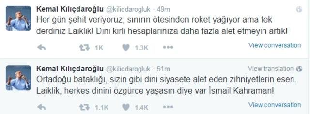 Kılıçdaroğlu Twitter sayfasında, "Laiklik her şeyden önce bir toplumsal barış ilkesidir. Toplumsal barışımıza çoktandır kastedenlerin bu ilkeyi yok saymasına şaşırmamalıyız!" diye yazdı ve ekledi: