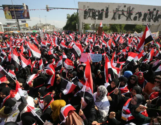 Iraklı Şii lider Muktada Sadr'ın çağrısıyla sokaklara dökülen yüzbinlerce kişi, kent merkezinden resmi binaların bulunduğu Yeşil Bölge'ye yürüdüler.