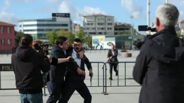 Saldırgana ilk müdahaleyi Can Dündar'ın eşi Dilek Dündar ve CHP Çanakkale Milletvekili Muharrem Erkek yaptı.