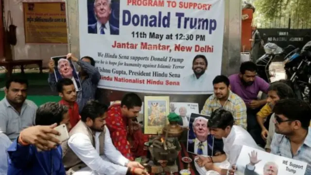 Hindu Sena adlı sağcı grup, “İslami teröre karşı insanlığın umudu olduğu için” Trump’ı desteklediğini söylüyor.