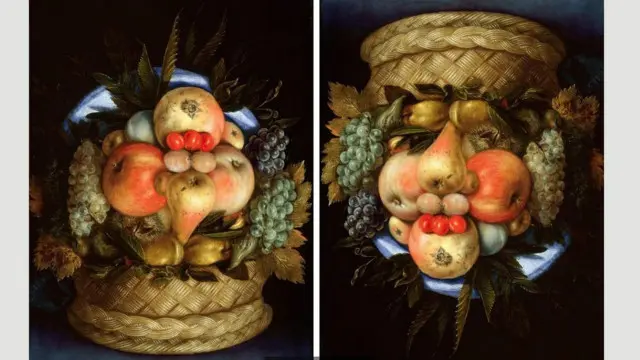 Tabloyu bir tarafa çevirdiğinizde elma, armut, üzüm incir gibi olağan sonbahar meyvelerinden oluşan bir natürmort, baş aşağı çevirdiğinizde ise meyvelerden oluşan bir yüz ve sepet şapka görürsünüz.