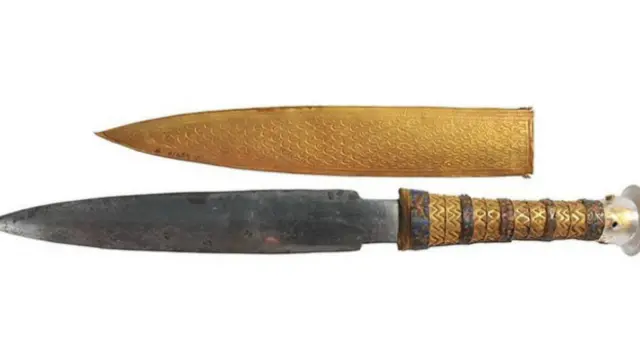 3300 yıldan fazla önce mumyalanan Tutankamon'un hançerinin süslü bir altın sapı ve bir tarafında çiçek desenleri, tüyler resmedilmiş olan altından bir kını bulunuyor.