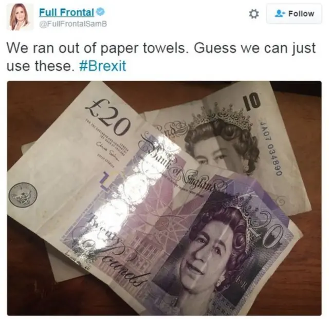 Sonucun açıklanmasından sonra İngiliz sterlini son 31 yılın en düşük değerinden işlem gördü. Bu tweet'te, sterlinin değerini kaybetmesine atıf yapılarak "Kağıt havlumuz bitti, bilin bakalım ne kullanacağız?" deniyor.