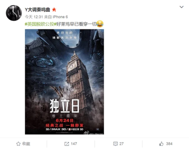 Bir kullanıcı İngiltere'nin bölünme olasılığına "Bağımsızlık Günü" filminin posterinin altına "Hollywood bunu çok önceden görmüştü" yazarak dikkat çekti.