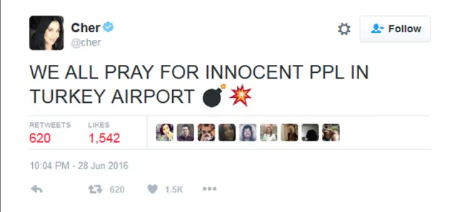 Cher'in Atatürk Havalimanı saldırısı tweetine tepki