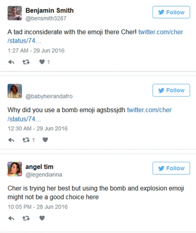 Benjamin Smith (@bensmith3287) adlı kullanıcı "Kullandığın emoji biraz uygunsuz kaçmış Cher!" derken, bir başkası, angel tim (@legendianna) "Cher iyi niyetli olabilir ama bomba ve patlama emojisi kullanmak bu konuda en iyi tercih olmayabilir" diyor.