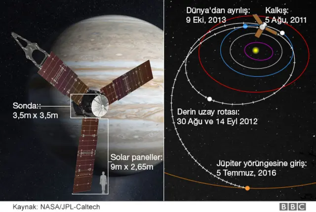 Dünya'dan <link type="page"><caption> beş yıl önce fırlatılan Juno</caption><url href="http://www.bbc.co.uk/turkce/haberler/2011/08/110805_nasa_juno" platform="highweb"/></link>, gezegene yaklaşırken hızını düşürmek ve Jüpiter'in manyetik çekim alanına girebilmek için roket motorunu ateşledi.