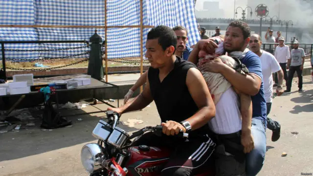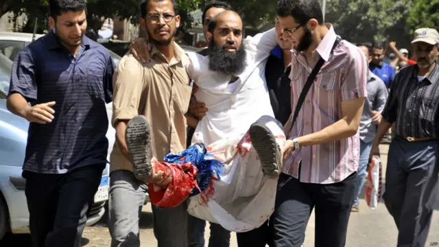 Fotoğraf altı yazısı, Mursi yandaşları önce Çarşamba günkü baskında öldürülen arkadaşlarının cenazelerini kaldırdı.