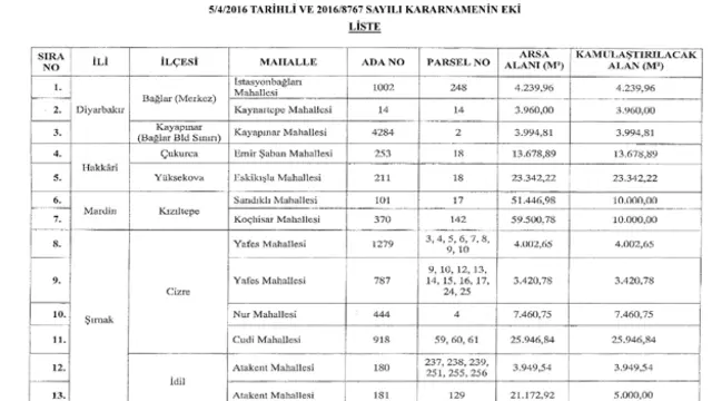 Diyarbakır'ın Bağlar, Hakkari'nin Çukurca ve Yüksekova, Mardin'in Kızıltepe, Şırnak'ın ise Cizre ve İdil ilçelerindeki 11 mahallede 36 parsel için toplam 120 bin metrekareye yakın alan hakkında acele kamulaştırma kararı çıktı.