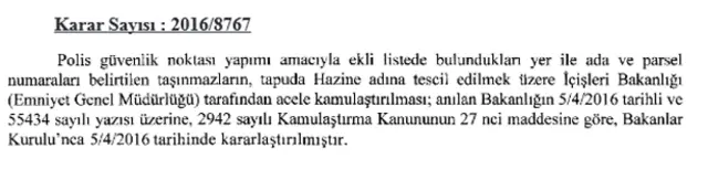 5 Nisan tarihli Bakanlar Kurulu kararının, "polis güvenlik noktası yapımı amacıyla" alındığı belirtiliyor.