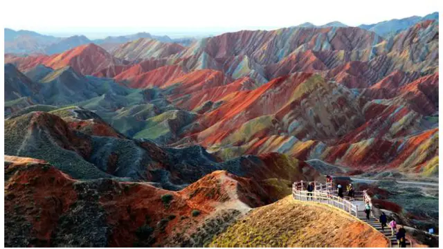 Çin’in kuzey batısındaki Gansu bölgesinde 24 milyon yıllık taş ve mineral birikintileri, gökkuşağı renginde katmanlar oluşturuyor. Dağların tepeleri Himalaya Dağları ile aynı tektonik plakadan oluşurken yağmur, rüzgar ve erozyonun etkisiyle etekleri bugünkü halini almış. 10 km kareye yayılmış bu dağlık alan, yağmurun ardından daha parlak bir hale bürünerek olağanüstü bir manzara oluşturuyor.