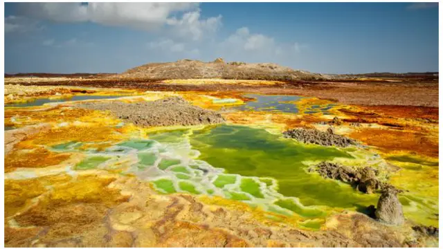 Etiyopya’daki Dallol Yanardağı bugün aslında bir yanardağdan ziyade çökmüş bir krater. Yeraltı suları ile magmanın karşılaşması sonucu ortaya çıkan kükürt, demir oksit, tuz ve diğer mineraller bugünkü canlı yeşil tonları, neon sarılarını yaratmış; dünyanın en erişilmez, en el değmemiş doğal ortamlarından birini. Etiyopya’nın Eritre sınırındaki bu krater 2001’e kadar yabancılara kapalıydı. Bugün de güvenlik sorunları nedeniyle ancak birkaç yüz turist burayı gezebiliyor.