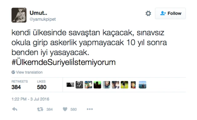 "Kendi ülkesinde savaştan kaçacak, sınavsız okula girip askerlik yapmayacak, 10 yıl sonra benden iyi yaşayacak. #ÜlkemdeSuriyeliİstemiyorum"