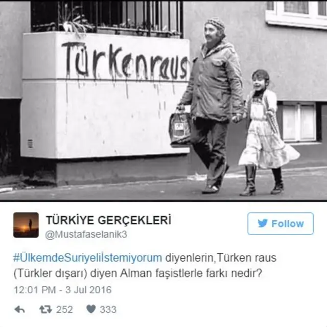 Cumhurbaşkanı Recep Tayyip Erdoğan'ın Türkiye'de yaşayan Suriyeli mültecilere vatandaşlık hakkı verilebileceği yönündeki açıklaması üzerine sosyal medyada yüzlerce kez paylaşılan mesajlardan biri bu.