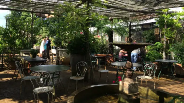 这 Petersham 的“花园”,归一对富有的意大利夫妇所有,他们在上世纪90年代买下这块地,然后在2000年左右开始装修,并且对外开放。这花园的生意经营,都完全交给职业经纪人打理。他们不仅从澳洲请来了名厨为他们的餐厅精心制作菜品,而后还在2012年左右又加开了 Teahouse (茶室),当然啦,菜单跟食物一定是意大利特色的,它们的蛋糕是每天新鲜的手工制作,咖啡是手冲滤泡的,要喝茶的话,也绝对保证不是袋泡茶,是新鲜的茶叶现冲泡,这样的规模阵势,让人以为是不是这间小花园在一个一本正经的高档茶餐厅。其实,根本不是那么回事儿,这间小花园,是无碳环保的“绿色”建筑。它的特别之处,至少在我看来,它是完全大自然的。房屋顶棚是木头搭建的,地面就是黄沙地。几百米开外主人应该还养了些牛羊,所以,动物散发出来的气息,加之这花园里还卖些小盆栽,以及各种样式的,大小不一的树木等,简直让人觉得一边喝着经营者们那么精心挑选的茶或者咖啡,一边又在担心是不是牛羊一会儿也来跟你“抢食”。遇上周末好天气,或者圣诞节期间,造访最多的仍然还是以家庭为单位的,因为这里完全适合家庭型的聚会。小孩子们在乡间玩耍的同时,大人们喝个下午茶,离开的时候可以顺带采购盆栽,跟餐具用品,是周末家庭聚会的好选择。