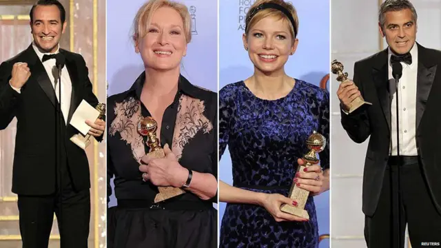 金球奖四大奖项得主:(自左至右)《艺术家》(The Artist)男主角让·杜雅尔丹(Jean Dujardin)、《铁娘子》(The Iron Lady)女主角梅丽尔·斯特里普( Meryl Streep)、《我与梦露的一周》(My Week with Marilyn)女主角米歇尔·威廉姆斯(Michelle Williams),以及《后裔》(The Descendants)男主角乔治·克鲁尼(George Clooney)。