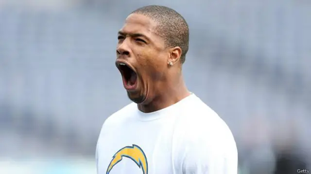 圣地亚哥教士队的达纳里奥·亚历山大(Danario Alexander)在美国橄榄球比赛开始前打着哈欠。