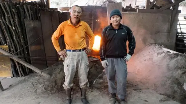 在冈崎光男的工作室,他和他的助理正忙着制作Kishu Binchotan。他们拿着挂在钩子上的长长的金属耙子,将它们够到烧窑里头。灰烬在空气中飘着,制造出了一种朦胧感,黯淡了烧窑发出的火光,直到附着到任何它能够找到的物体表面上。