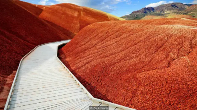 这片国家保护区的亮点就是引人入胜的彩绘山。这里不像美国西南部所谓的红砂岩,红砂岩实际上有着橘红色和黄色的色调,而俄勒冈中部看到的这种颜色来源于约翰戴伊岩层最底部的大约3300万年前的红色火山灰。想见识这样瑰丽的色彩,你必须沿着四分之一英里的画湾小径步行,这个高出地面的木板道位置隐蔽,同时也保护了这片山脉不被人类开发。(图片来源:扎克·弗兰克)