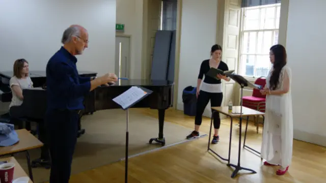 在一個正規的歌劇劇組裏,專業分工非常細緻。除了演員,還有導演、指揮、coach(歌詞指導)等重要角色。我在現場時,導演正和王蓓蓓排練。「呆會導演會排舞台走位。」她說。