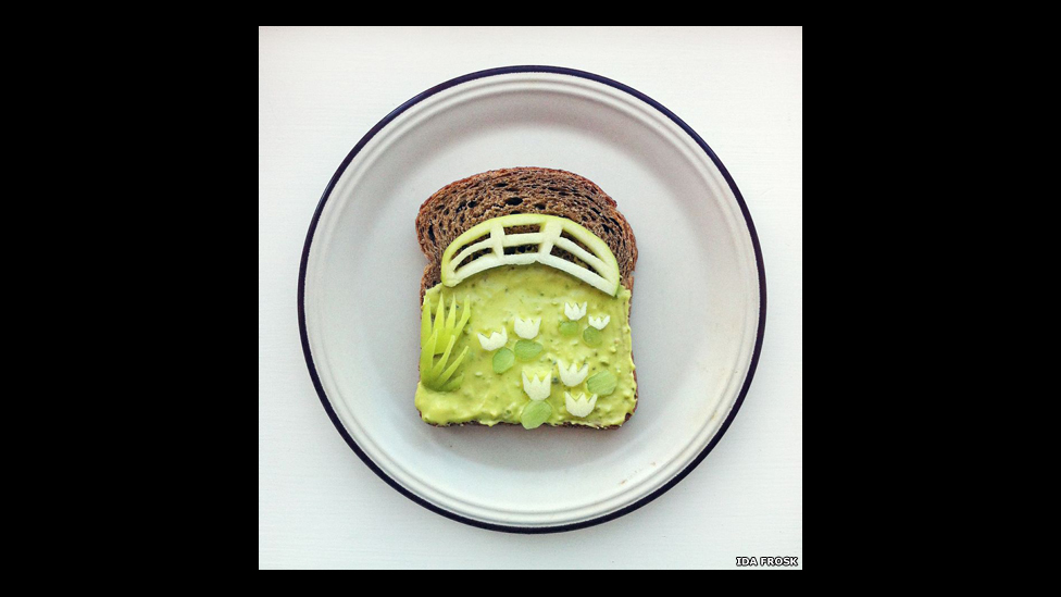 This toast was "inspired by the beautiful water lilies by the French painter Claude Monet. The green colour was captured well by using pistachio butter as the background... The lilies and bridge were cut out of apple pieces, and the water lily leaves are made of kiwi."